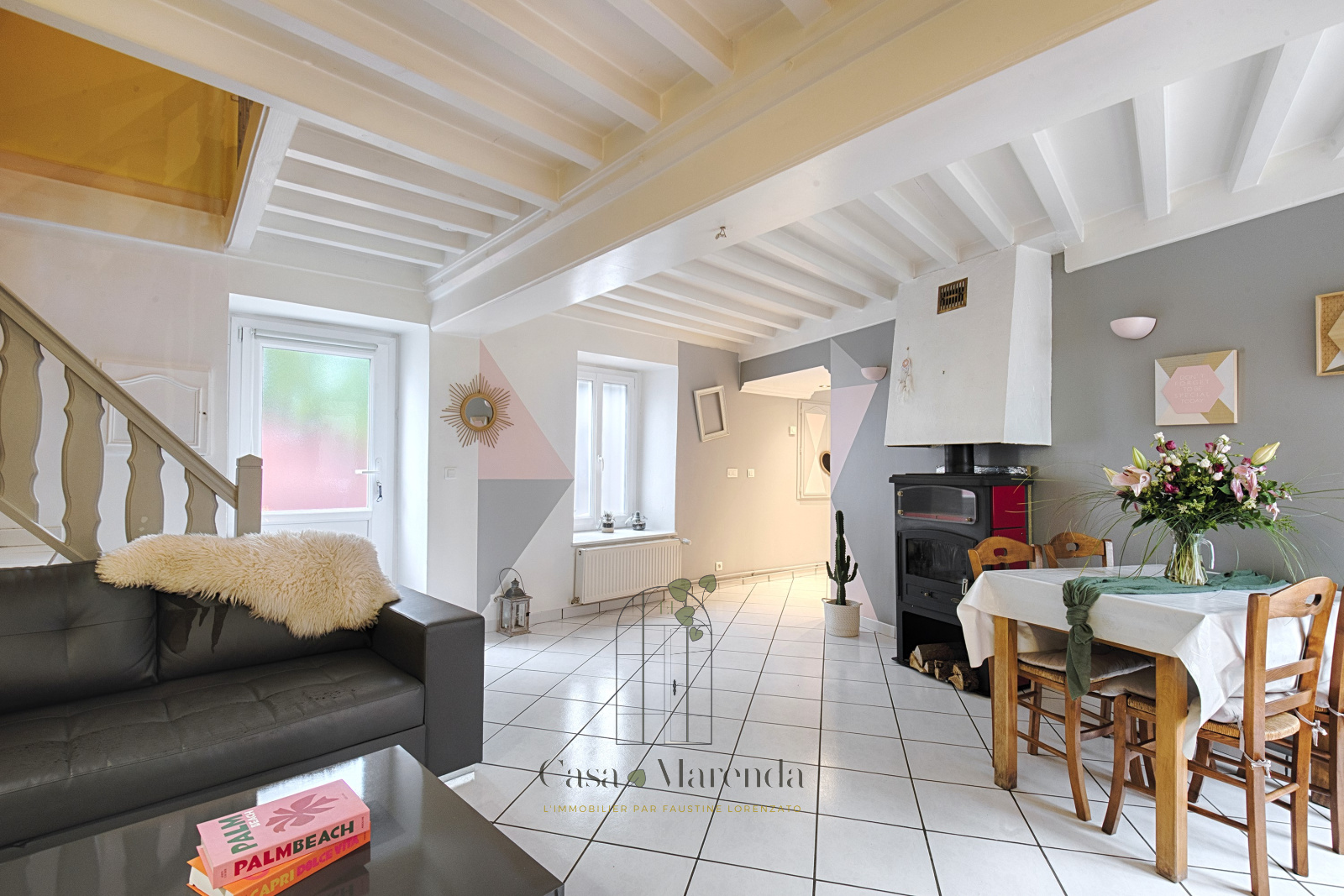 Composée au rez-de-chaussée d’un agréable séjour avec poêle à bois, une cuisine équipée et fonctionnelle avec son coin repas, toilettes.